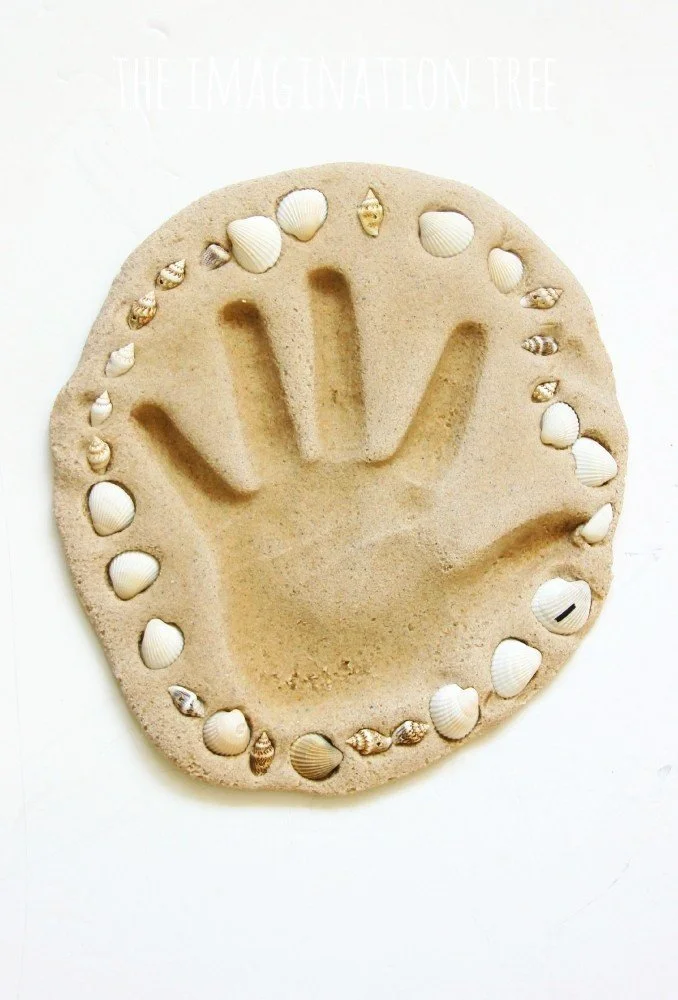 Choose from a variety of options, including a sand and beach themed keepsake with seashells or a more traditional white circle handprint with a bow.